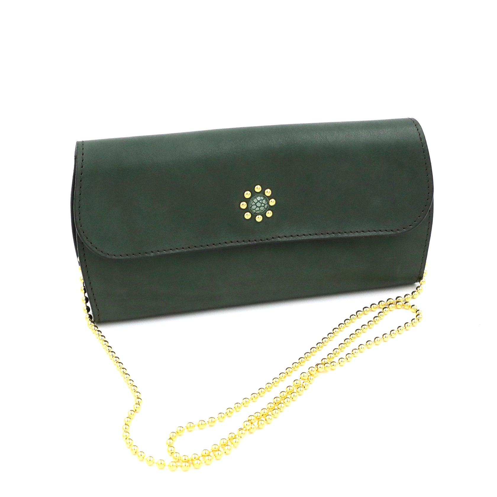 優しい印象のオーバルシルエットのクラッチウォレット。スマートフォンなどの小物も一緒に入る大きめサイズです。真鍮製、本金メッキが施されたボールチェーンは取り外しができ、長さもリングに通して2重、3重にアレンジできます。