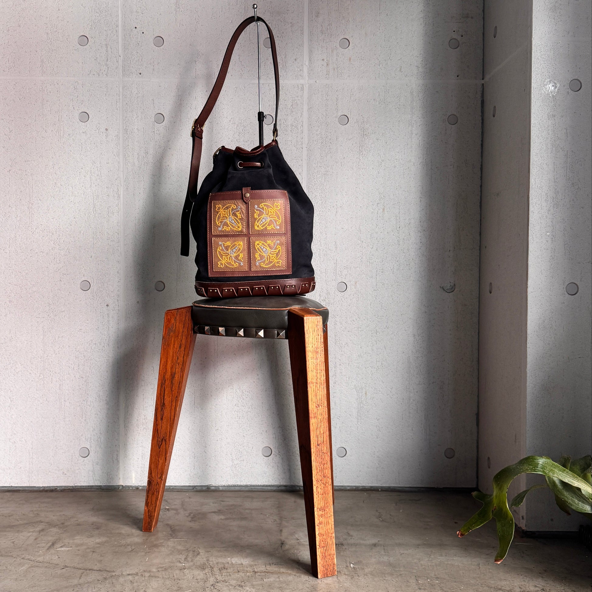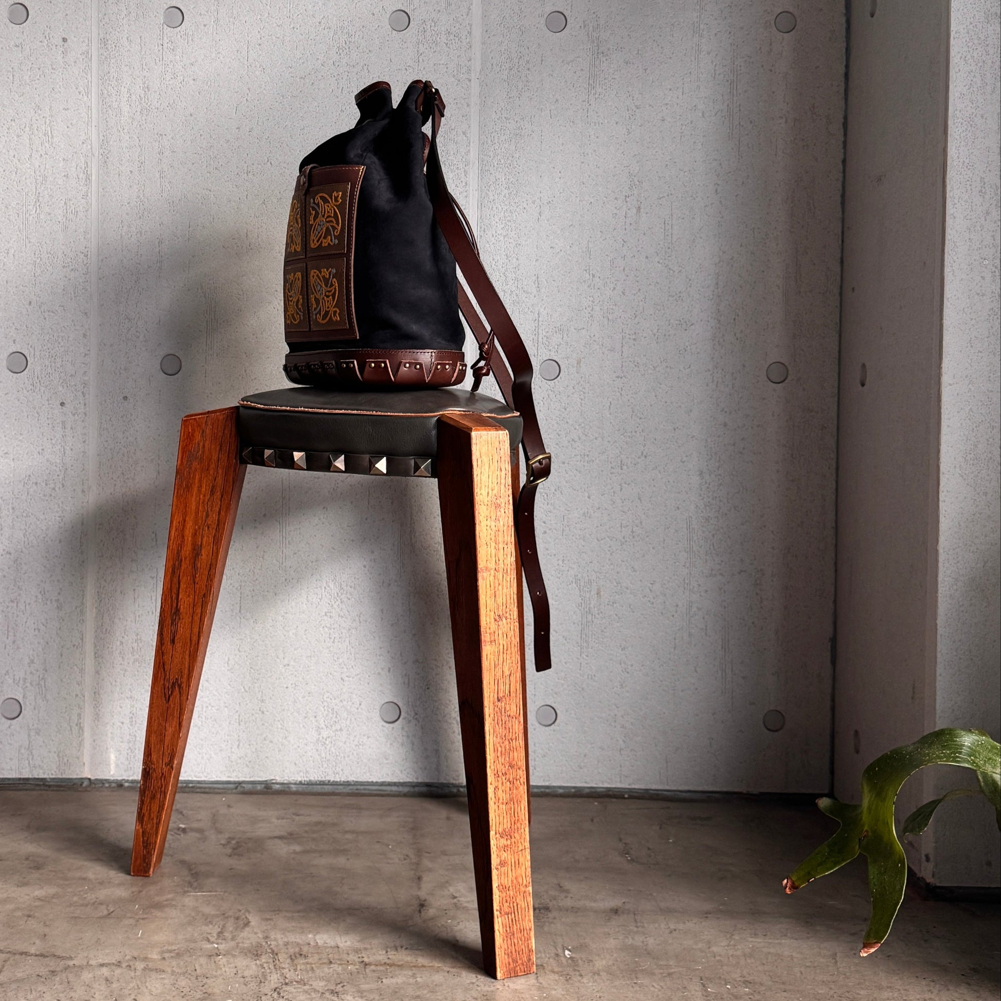 MOQUIPオリジナルの牛オイルレザーを起毛させた柔らかいヌバック仕立ての、ふっくらとしたシルエットの巾着バッグ。ダークブラウンのパーツは堅牢な牛革で、底のトリミングはMOQUIP独特の構築的なリベット使いで仕立てられたクラフトワークが詰まった逸品です。