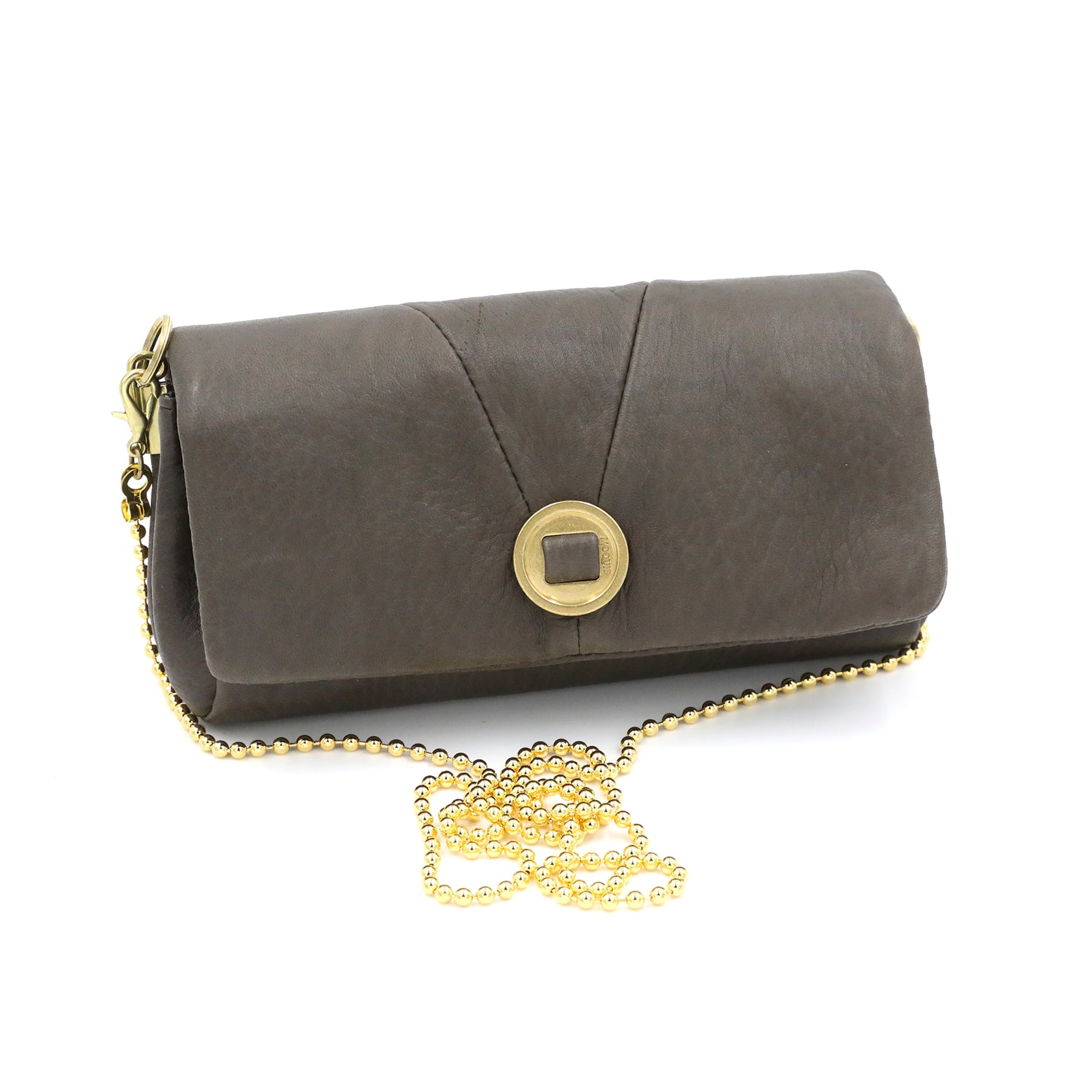 ふっくらとしたシルエットで、スマートフォンなどの小物も入るパース。真鍮製本金メッキのボールチェーンは取り外しができ,リングに通して長さのアレンジもしていただけます。