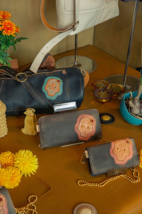 ATSU LEATHER WORKS とのコラボレーション。Dia de Muertosからインスピレーションを受けたカラベラモチーフのそのかわいい表情は、先祖への感謝と生きる喜びが表現されています。ATSUのモチーフTonyのアミーゴMoniは、ATSU独自の技法でスタンピングした部分に天然のピグメント、珊瑚の粉末でMOQUIP仕様におめかししてもらいました。