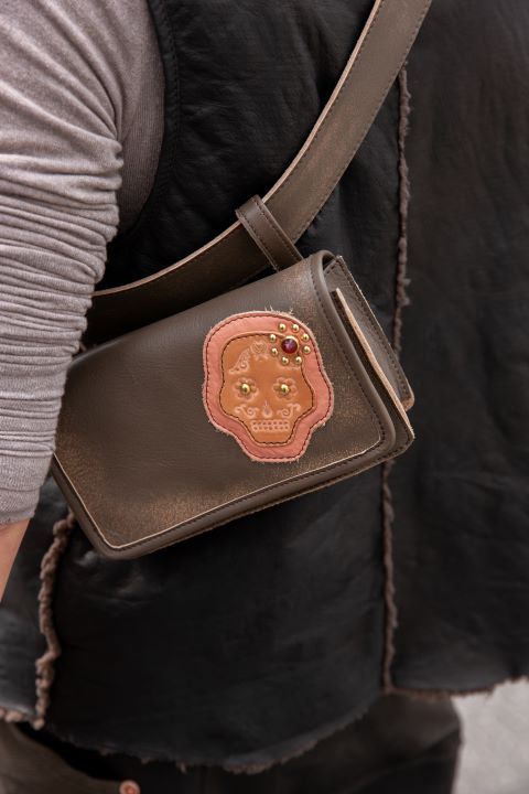 ATSU LEATHER WORKS とのコラボレーション。Dia de Muertosからインスピレーションを受けたカラベラモチーフで、そのかわいい表情は、先祖への感謝と生きる喜びが表現されています。ATSUのモチーフTonyのアミーゴMoniは、ATSU独自の技法でスタンピングした部分に天然のピグメント、珊瑚の粉末でMOQUIP仕様におめかししてもらいました。