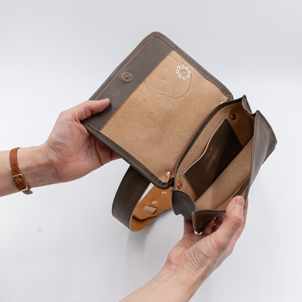 顔料、動植物の色素の意味を持つPigmentから作られた MOQUIPオリジナルのピグメントレザーは、植物タンニン鞣しで油を多めに含ませており、表面に顔料で色付けしています。仕立てた後にその顔料を部分的に剥がして、ヴィンテージ風の仕上げをしております。その隙間から浮かぶ茶芯(革の地の色のヌメ色)が奥深い風合いを出しています。