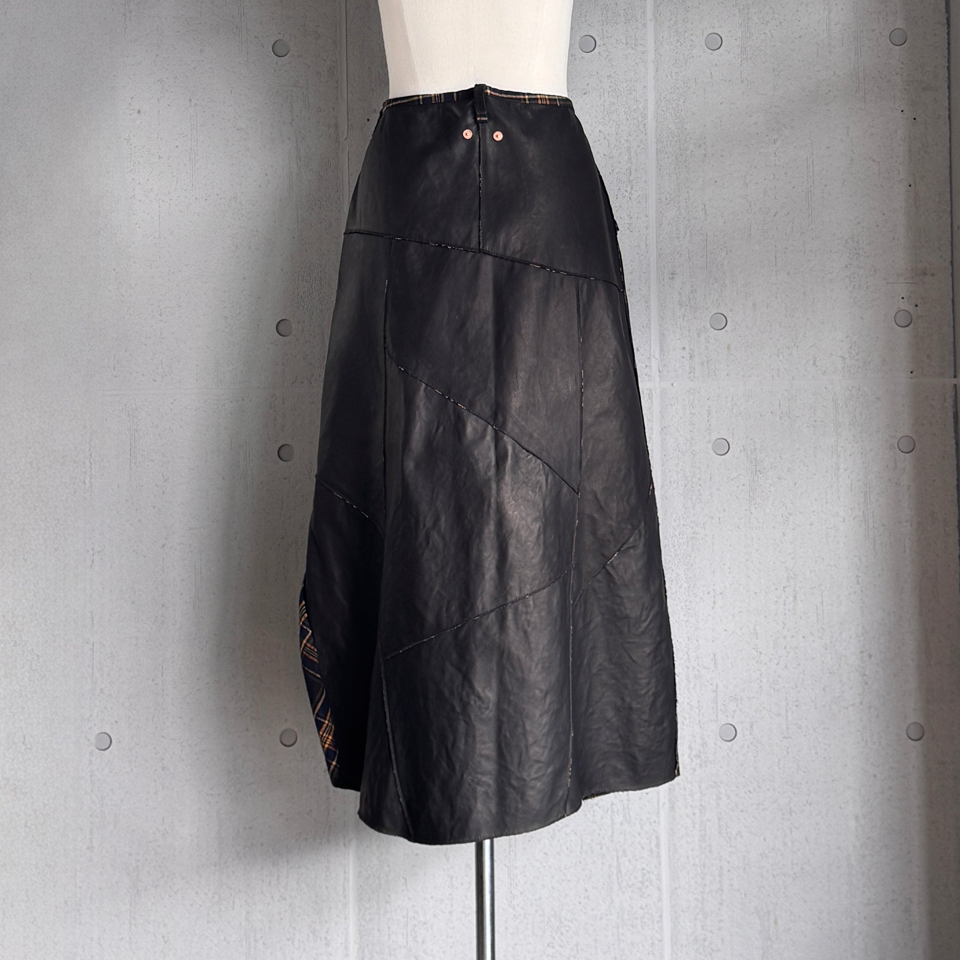 鹿は上品な顔立ちながら気性が荒い為、その革には比較的傷が多くみられますが、その反面、その手触りはシルクのように滑らかで柔らかく、吸い付くような質感が特徴です。0.3mmに薄く漉いた鹿革にボンディングした素材は、チェック柄綿100%のコットンビエラで、通気性、肌馴染みも良い洗える革のロングスカートです。
