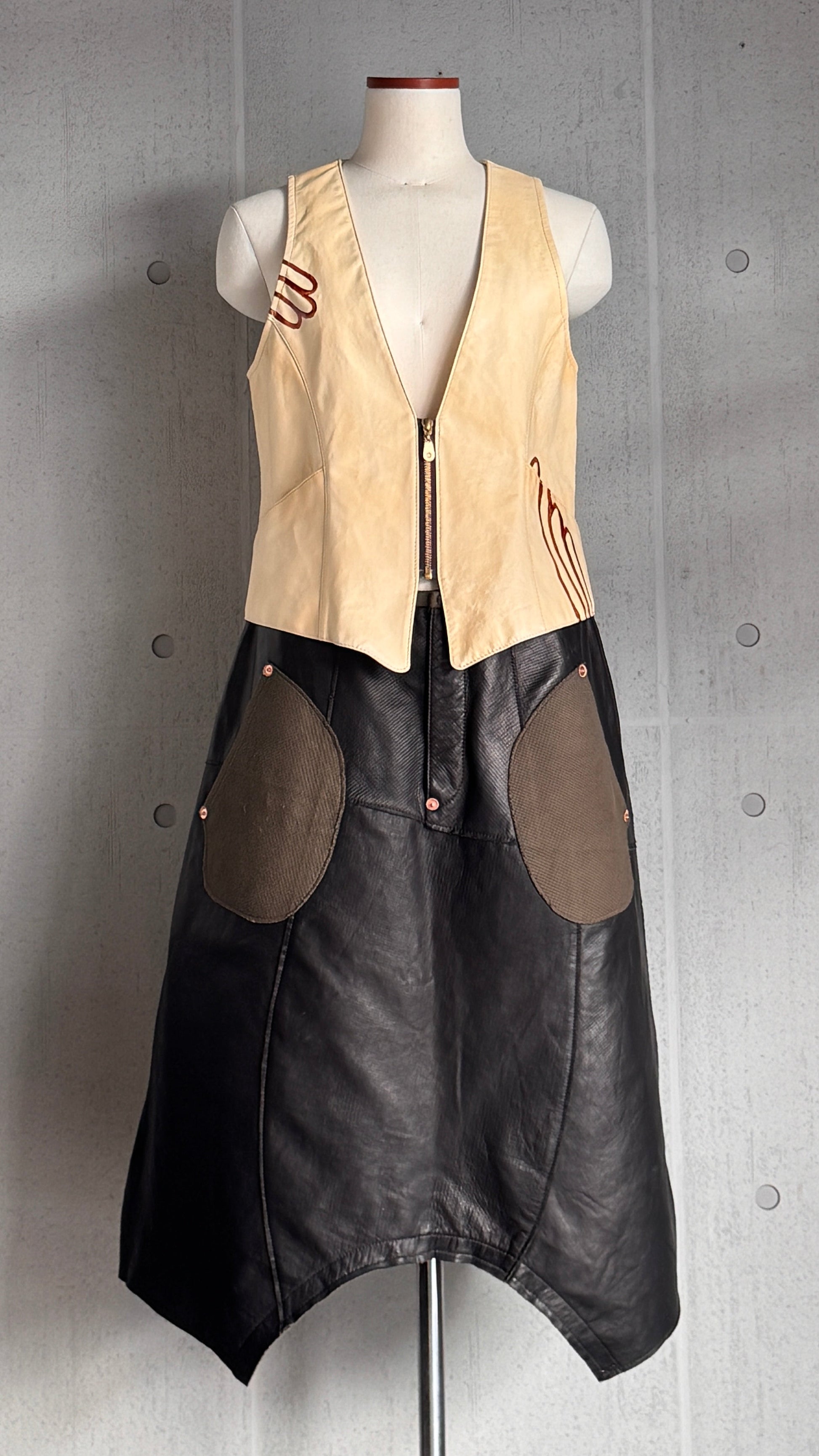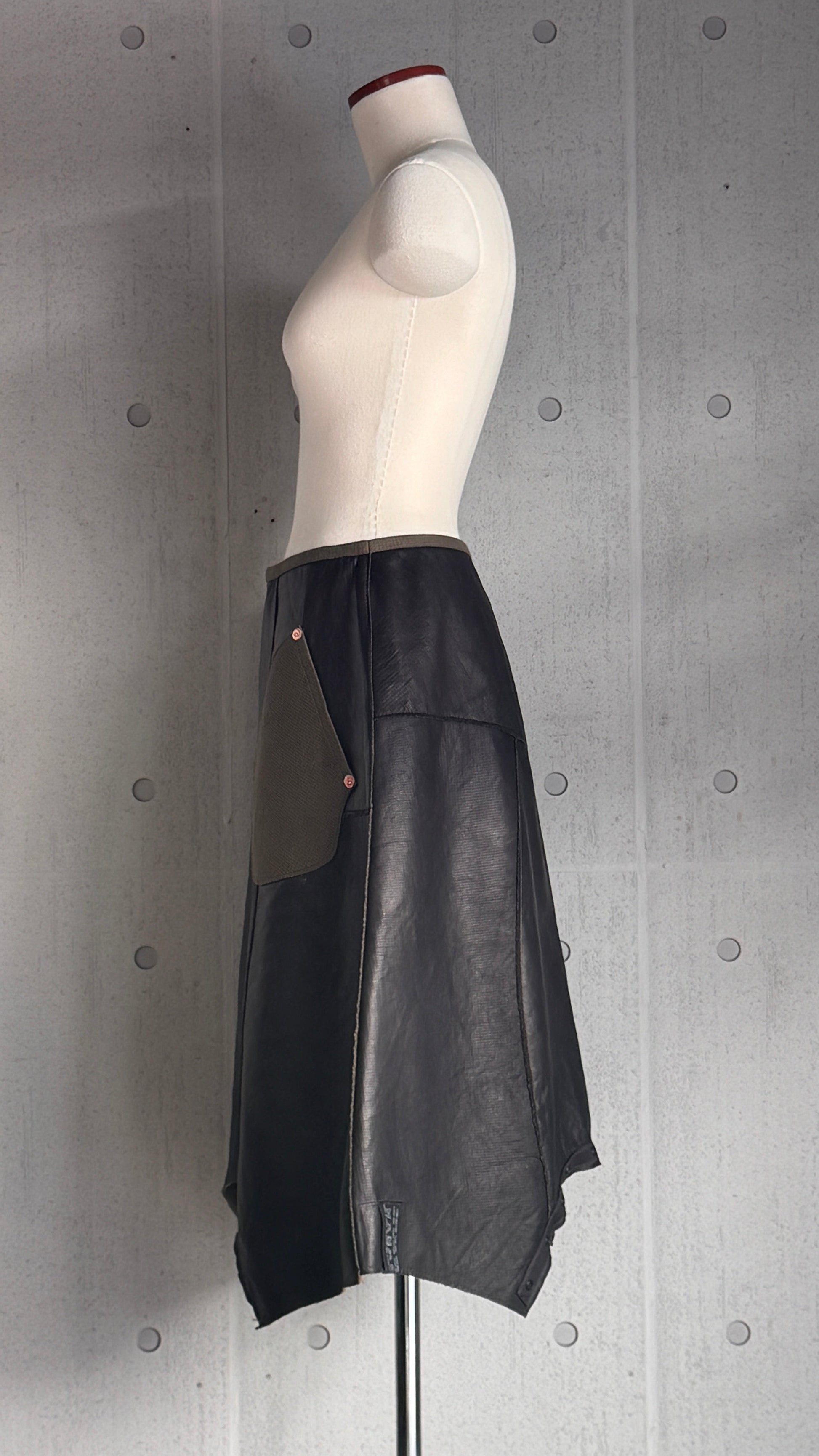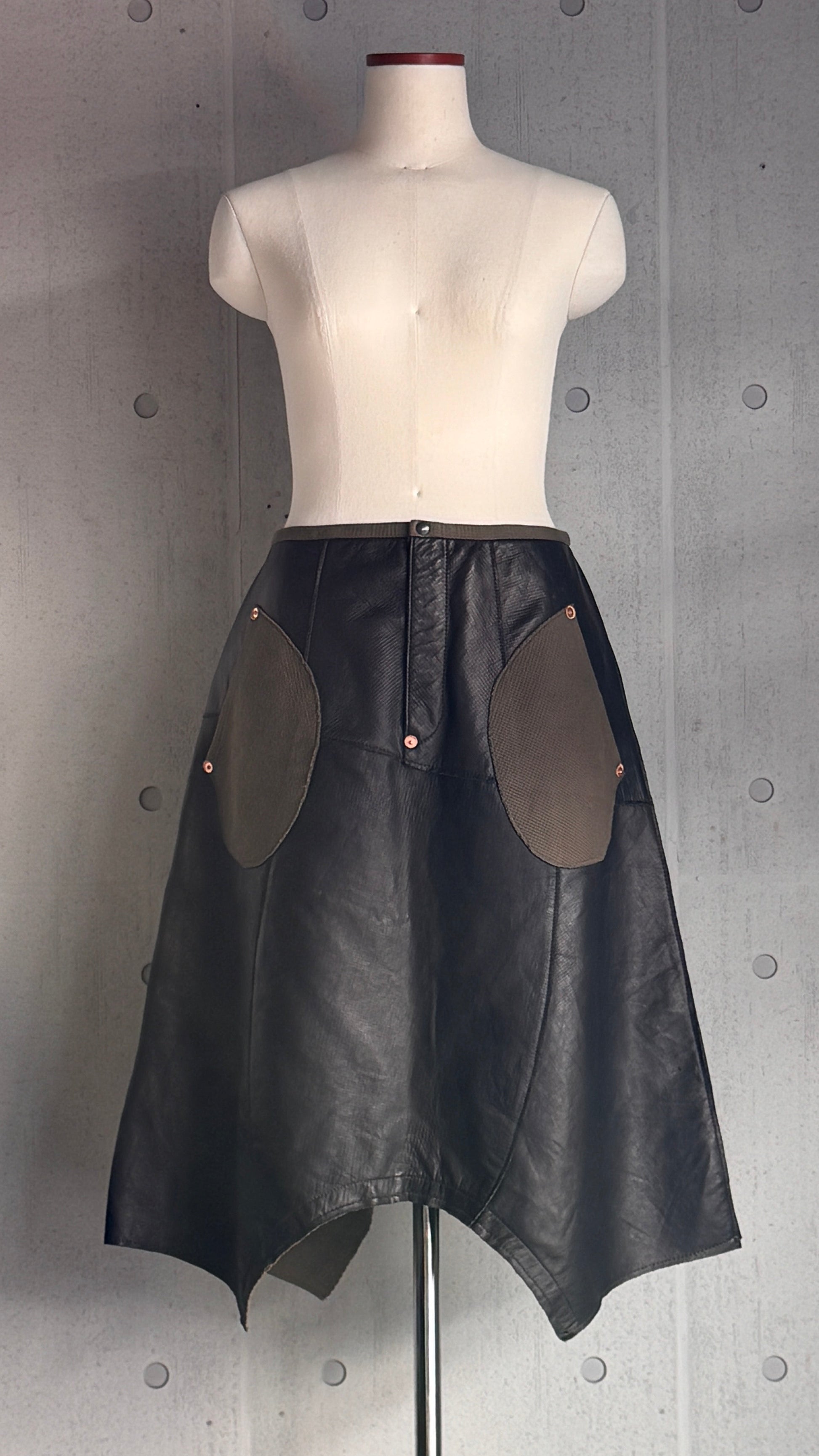 カーキ色のワッフル織のコットン&銅製リベット、ミリタリーテイストの効いたボリュームのあるシルエットの洗えるレザーウエア。渡りのスナップボタンをはずしてスカートに、留めてサルエルに、通年活躍する2wayボトムズ。仕立てた後に水洗いして、素材のシワ感、切りっぱなしのエッジのラフさをだして仕上げています。