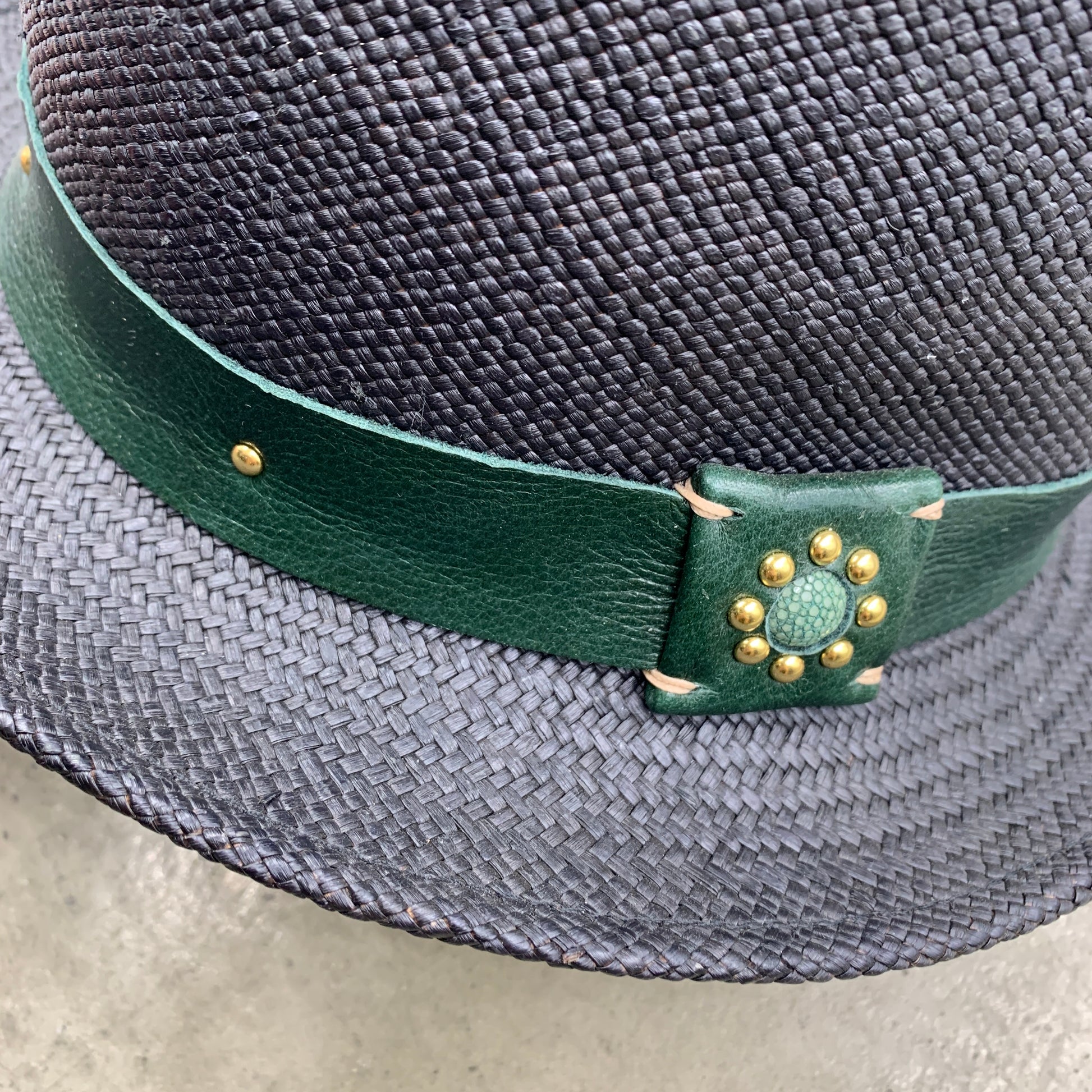 トリミングの革は水染め(革を染料に浸けて染める)で、上品なシボ、ツヤのある質感に仕上げた、ハットになじむ柔らかい牛革です。