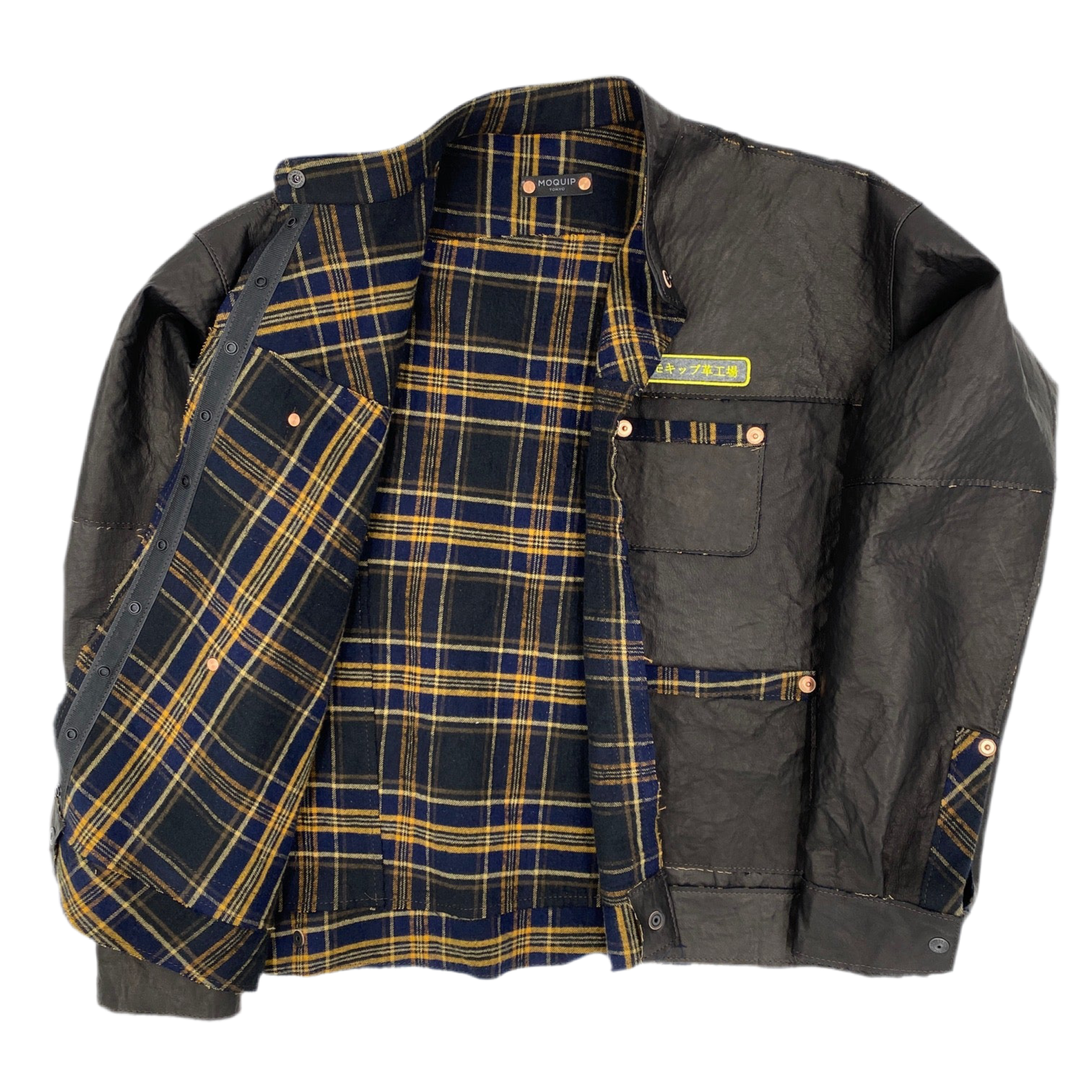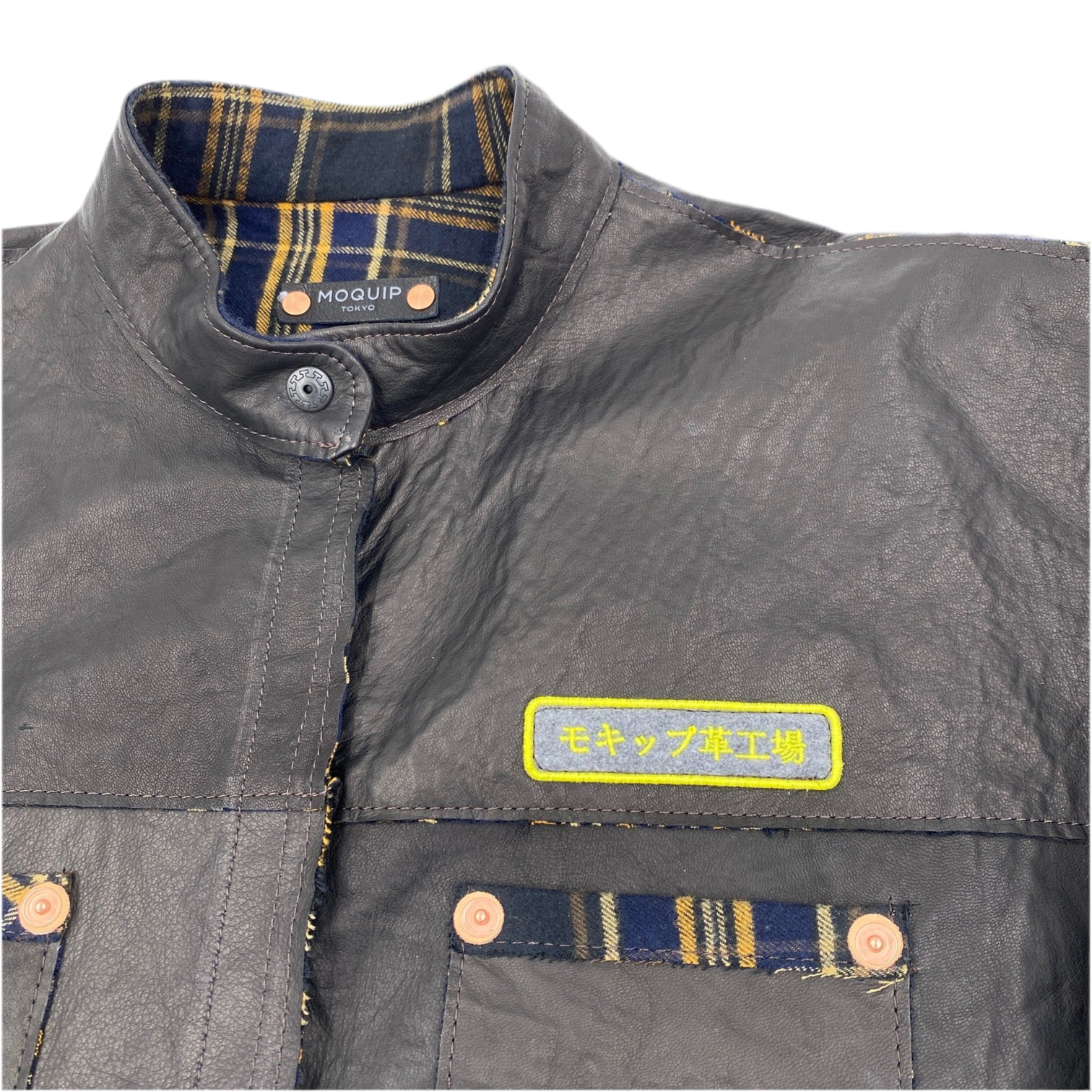 安全第一のイエローの刺繍が効いた「モキップ革工場」ユニフォームシリーズ。