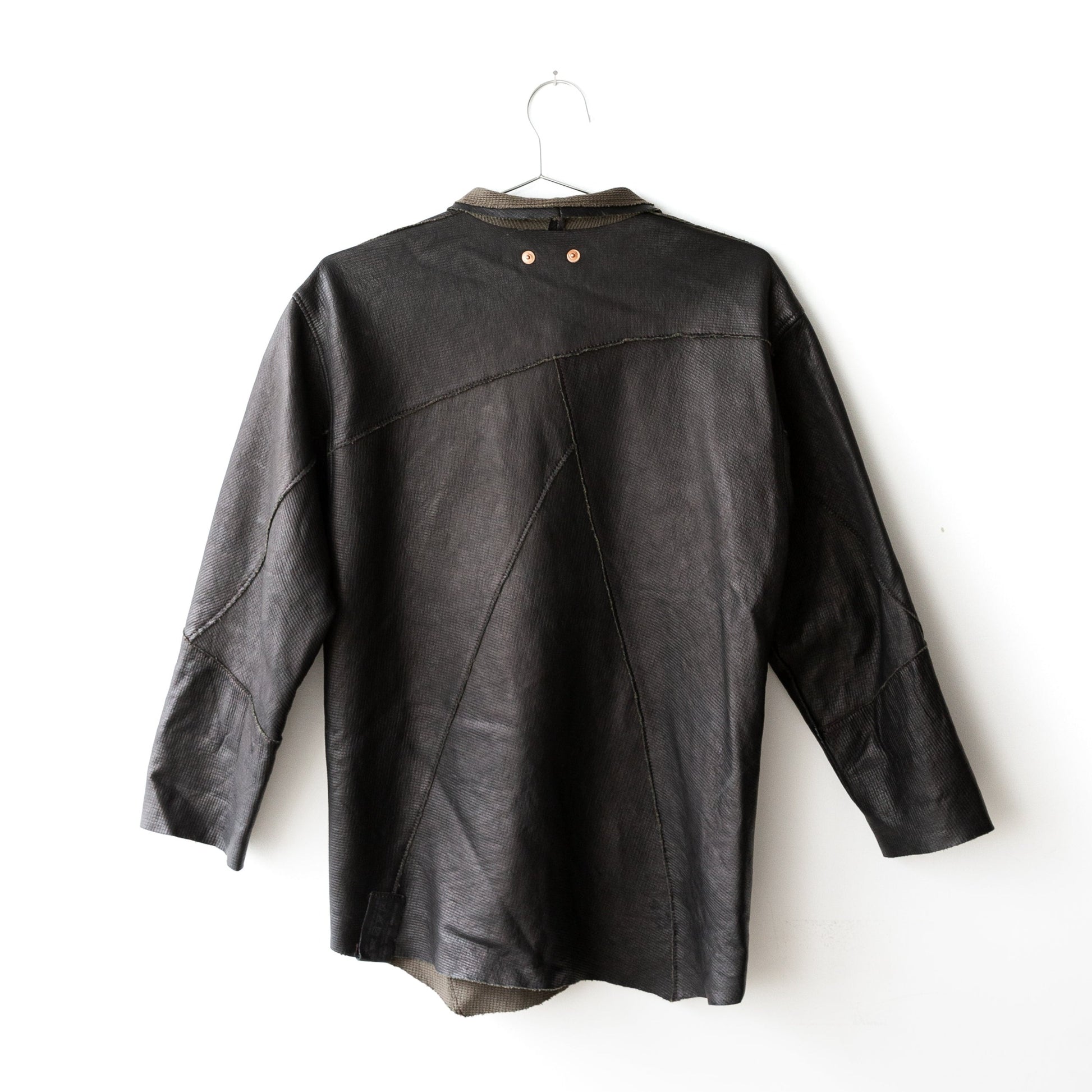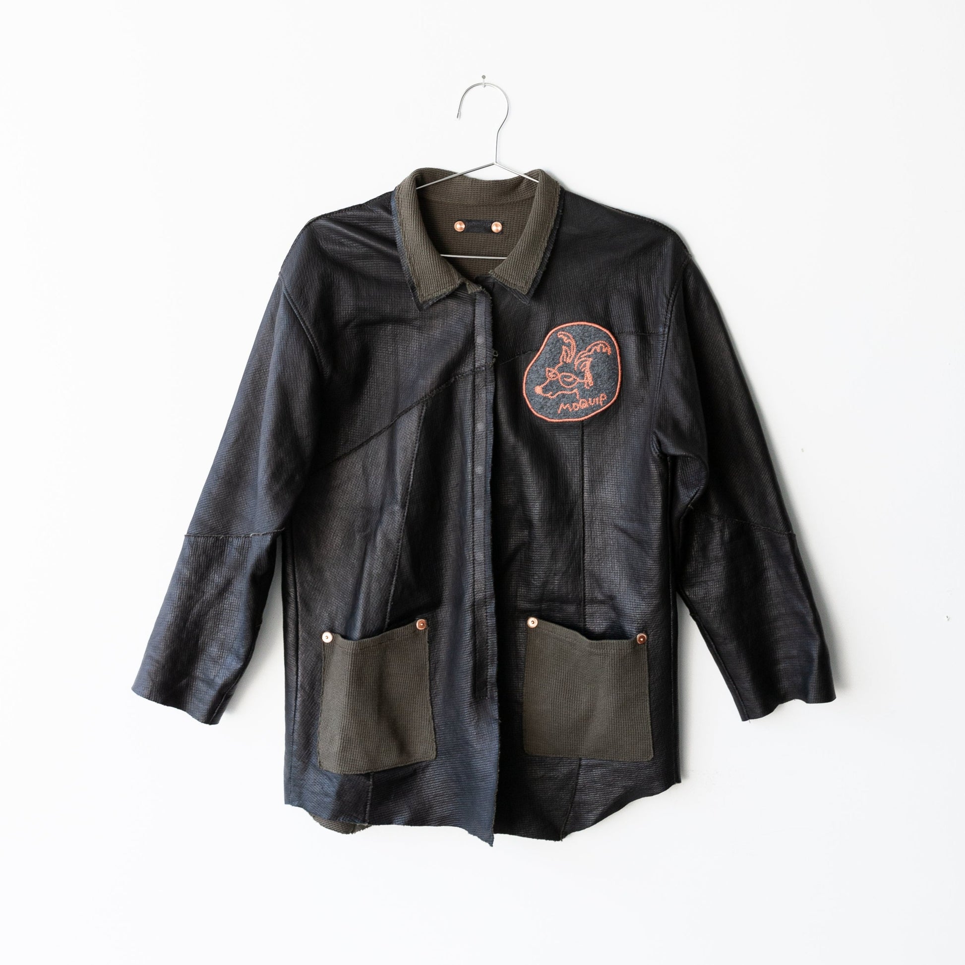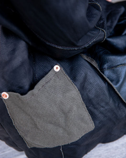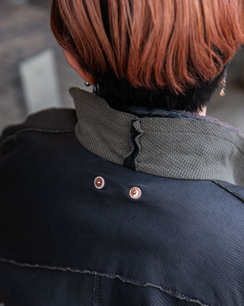 シンプルなビッグシャツシルエットに、パッチワークの切り替え、切りっぱなしのエッジ、リベットなどのワークディティールが詰まったジャケット。仕立てた後に水洗いして、素材のシワ感、切りっぱなしのエッジのラフさをだして仕上げています。