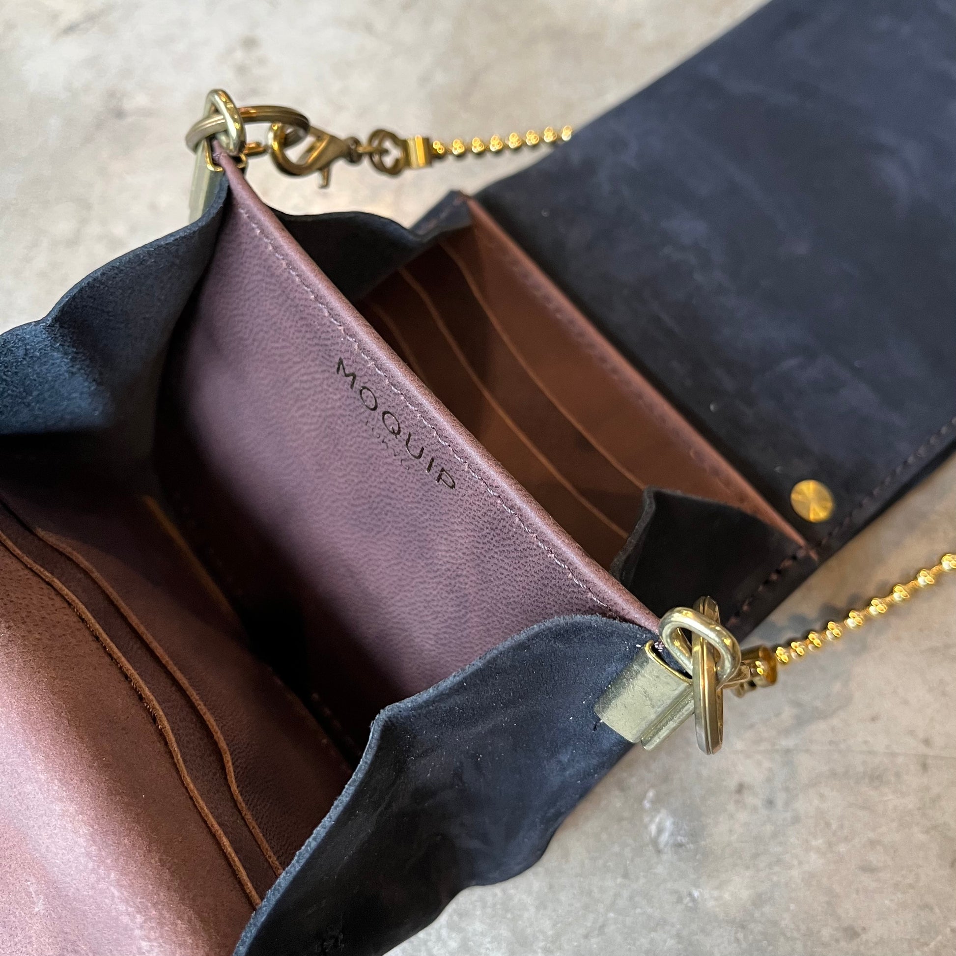 MOQUIPオリジナルの牛オイルレザーを起毛させ柔らかいヌバックで仕立てた、ふっくらとしたシルエットの手になじむコンパクトなパースです。内装のダークブラウンの革は羊革で、キメが細かく引き締まりしっとりとした質感で、ヌバックとのノスタルジックな雰囲気の配色にまとまりました。真鍮製本金メッキのボールチェーンは取り外しができ,リングに通して長さのアレンジもしていただけます。