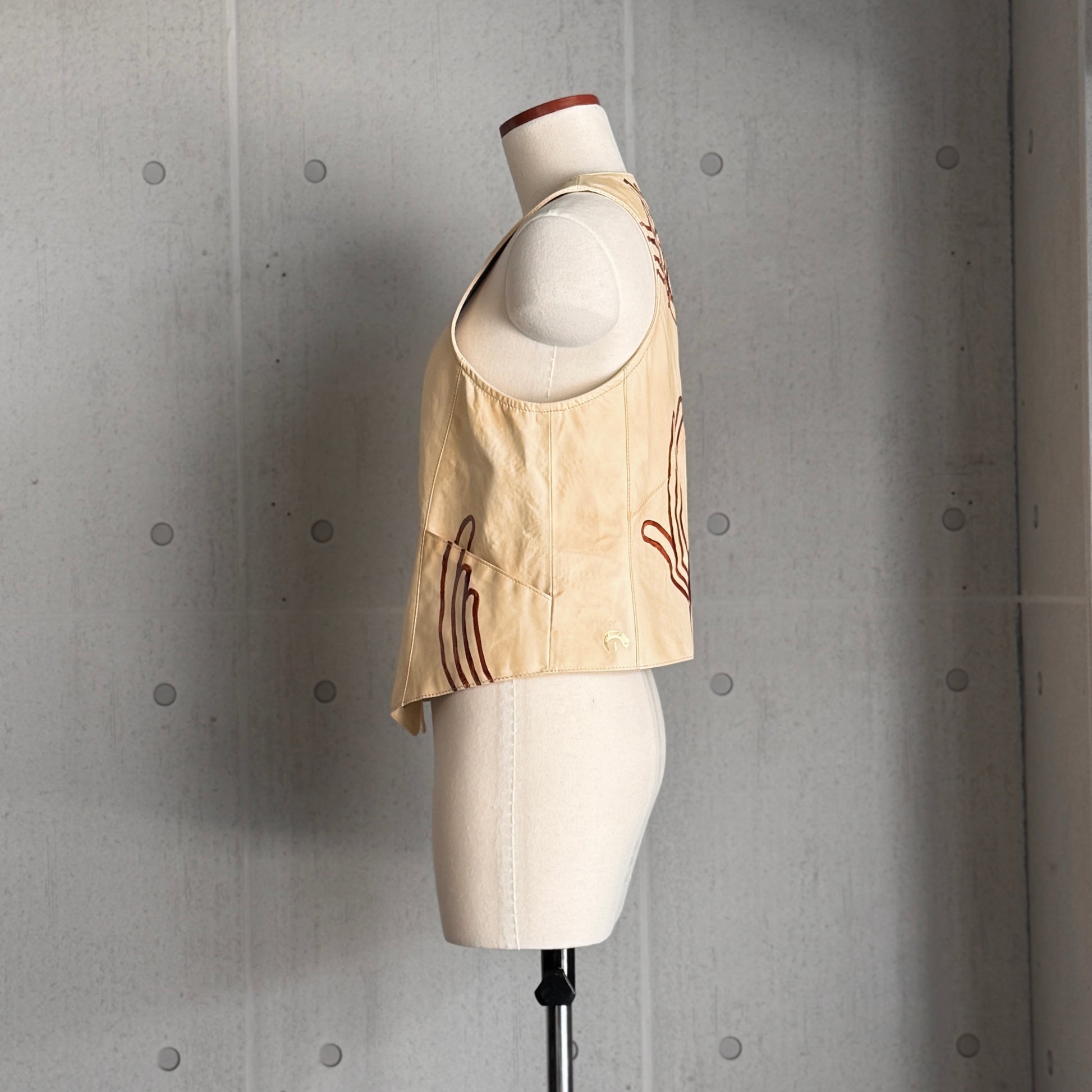 ウッディブラウンの顔料で色付けした生命力のあるラインと、すっきりとシンプルなシルエットのコントラストが美しいベストです。