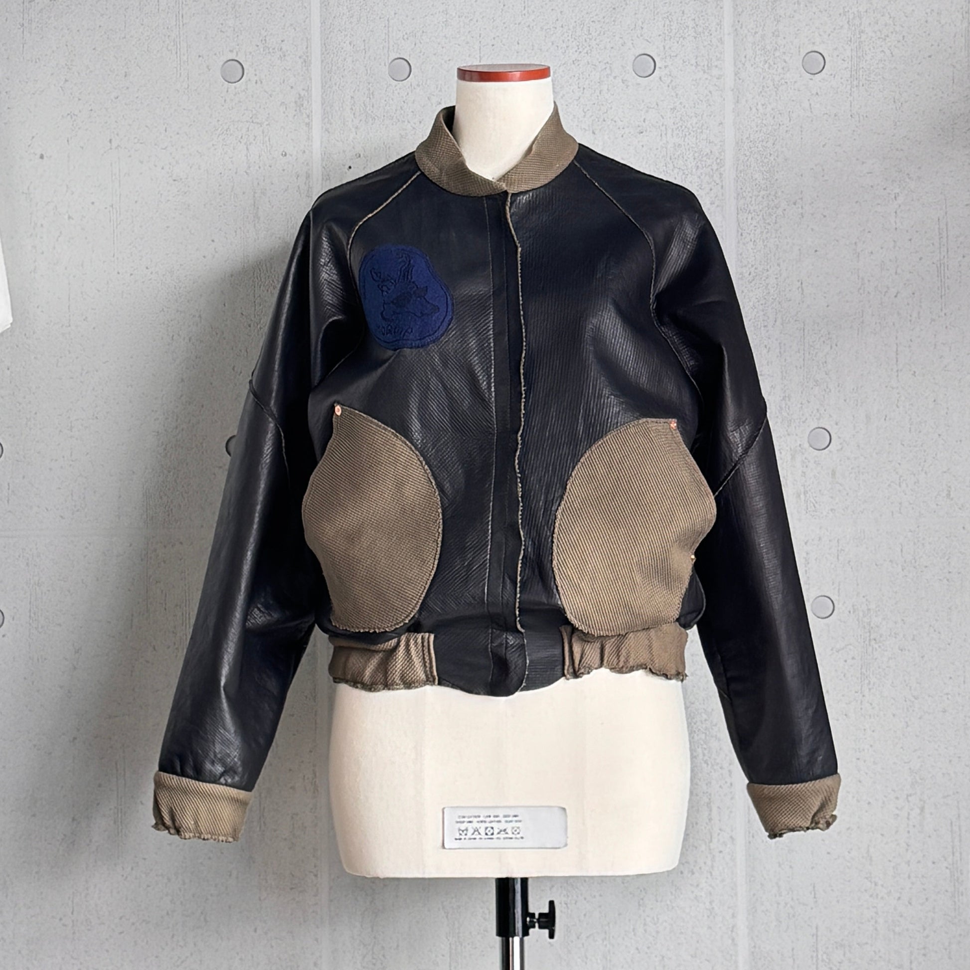 ラグランスリーブのブルゾンにちょい悪な鹿のキャラクターのワッペンがついたふっくらとしたシルエットのシカジャン。