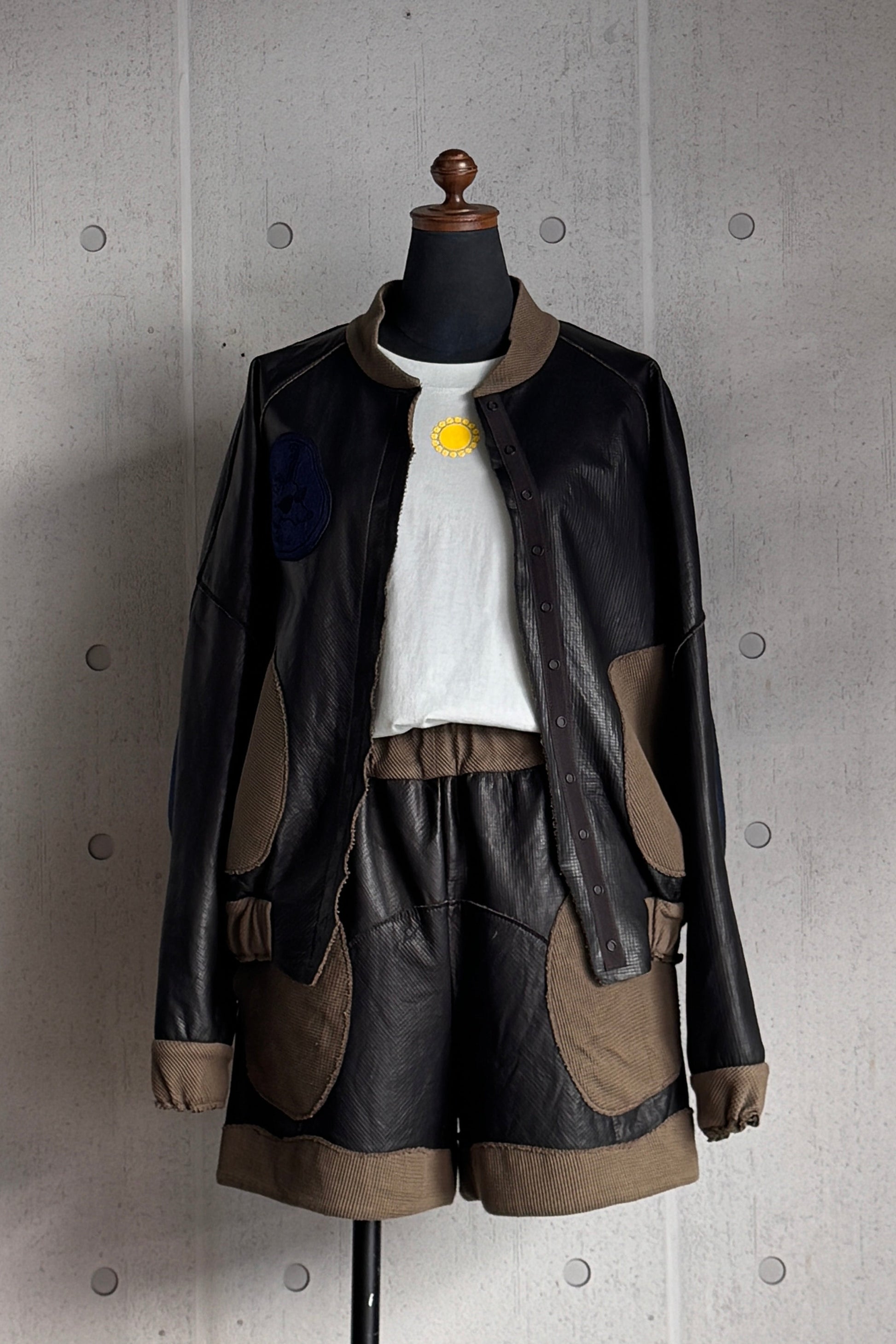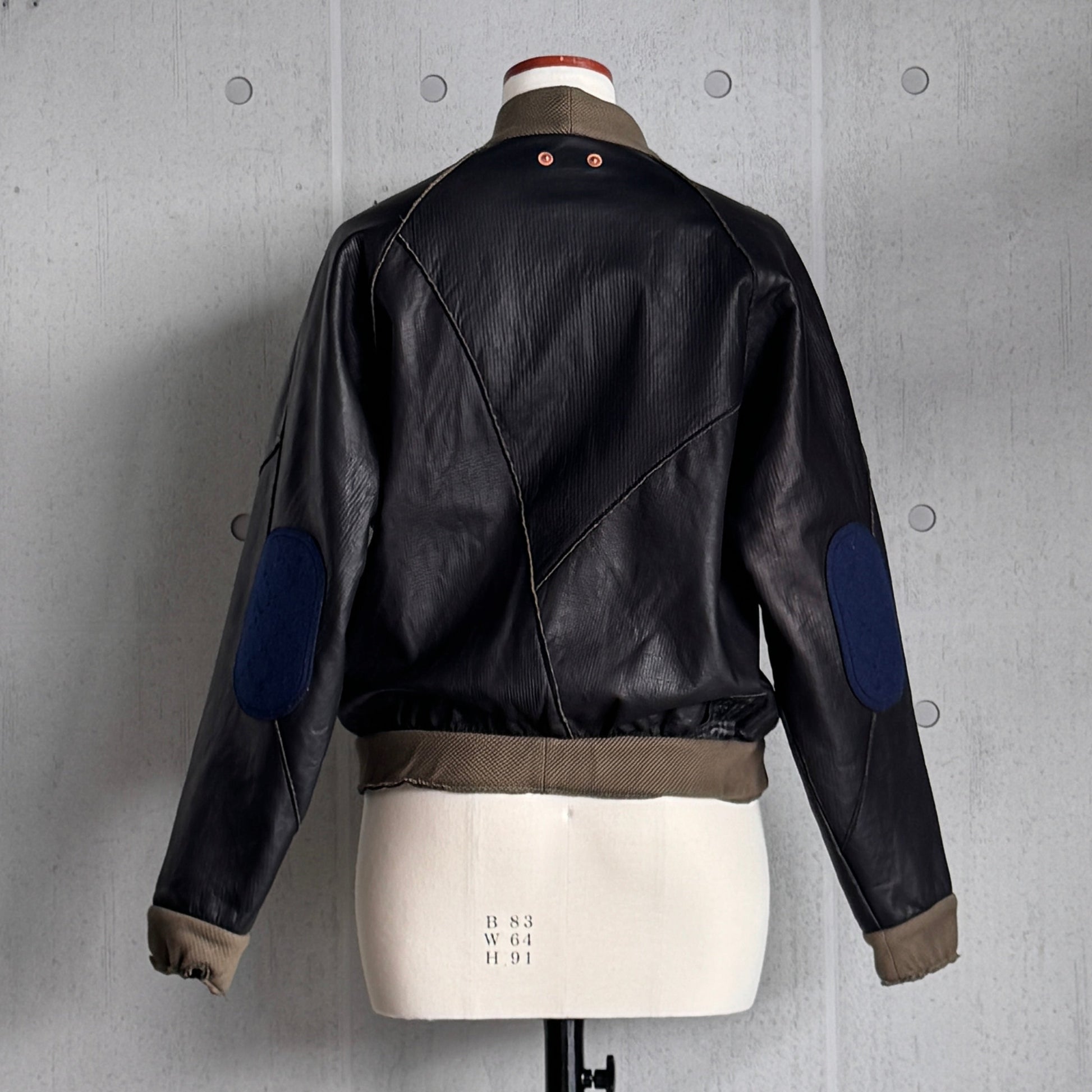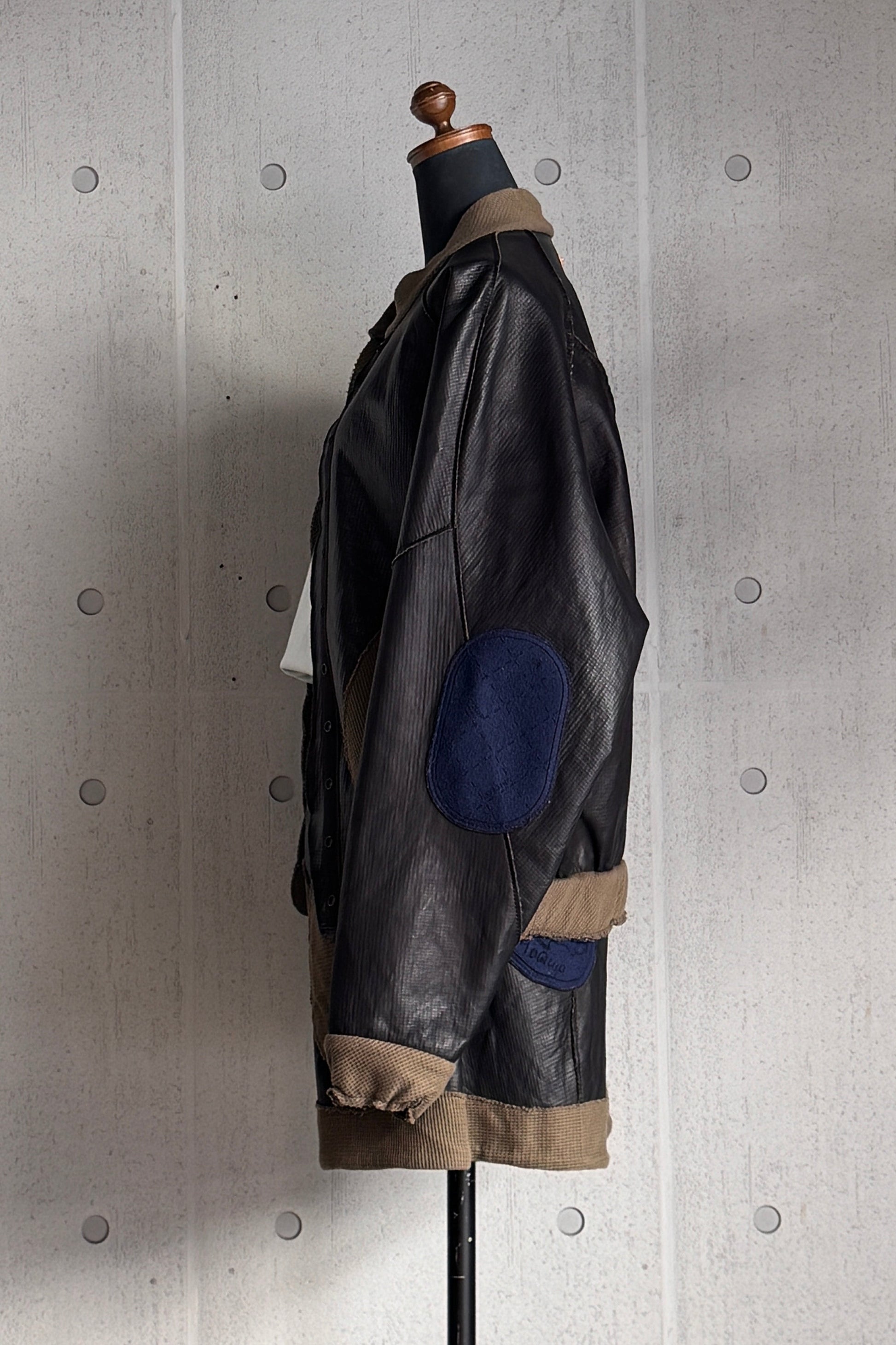 パッチワークの切り替え、切りっぱなしのエッジ、リベットなどのワークディティールが詰まったジャケット。仕立てた後に水洗いして、素材のシワ感、切りっぱなしのエッジのラフさをだして仕上げています。