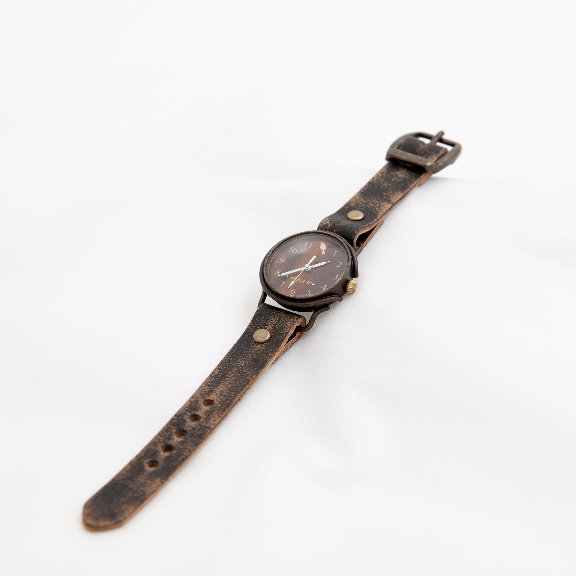 バンドは、顔料、動植物の色素の意味を持つPigmentから作られた MOQUIPオリジナルのピグメントレザーで、植物タンニン鞣しで油を多めに含ませており、表面に顔料で色付けしています。仕立てた後にその顔料を部分的に剥がして、ヴィンテージ風の仕上げをしております。その隙間から浮かぶ茶芯(革の地の色のヌメ色)が奥深い風合いを出しています。使い込むほどに手になじみ、味わいが増してきます。