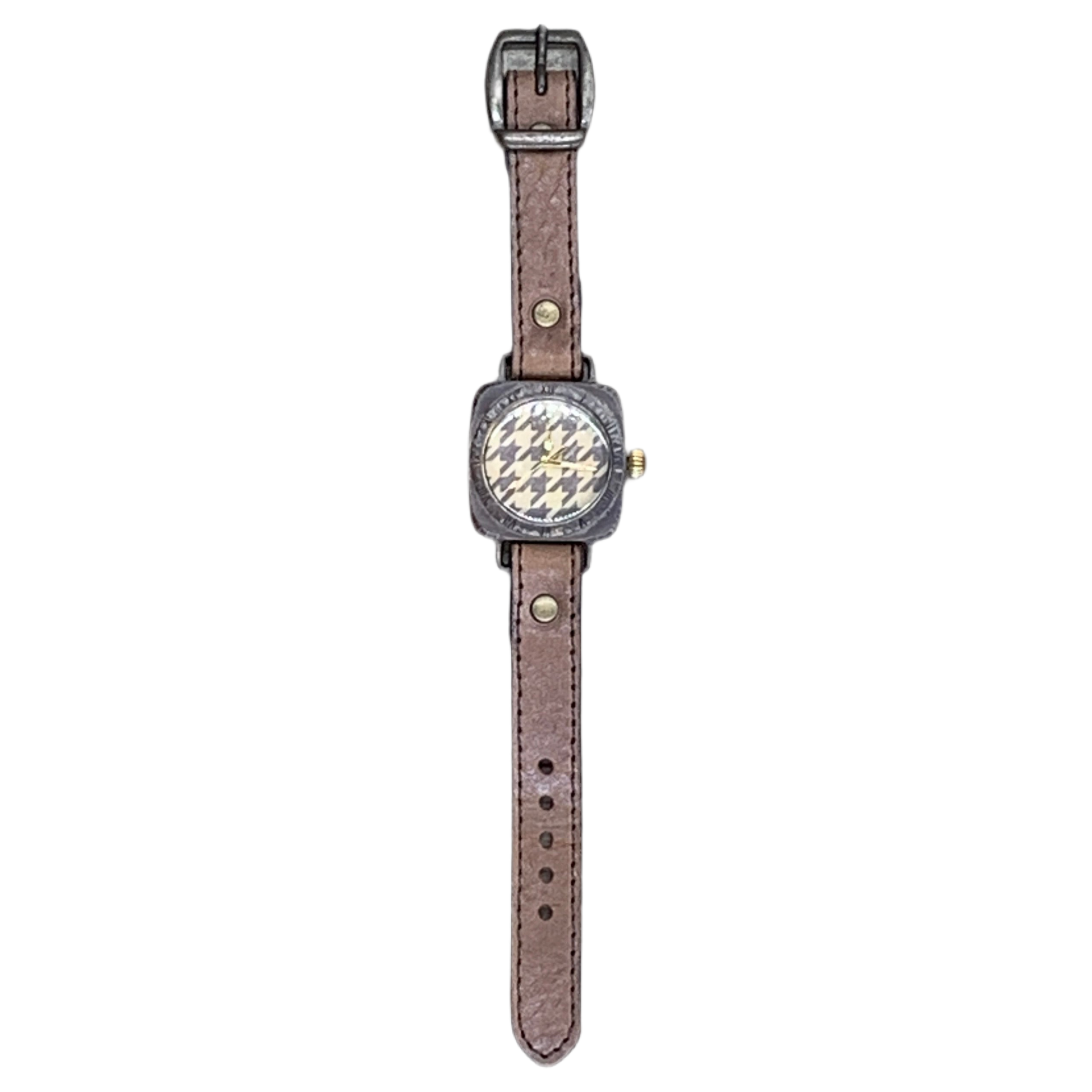 インデックスが刻まれた重厚なシルエットの真鍮製ケースに千鳥格子柄が描かれたレトロなウォッチ。ブラウン系のナチュラルで柔らかい印象の色合いです。