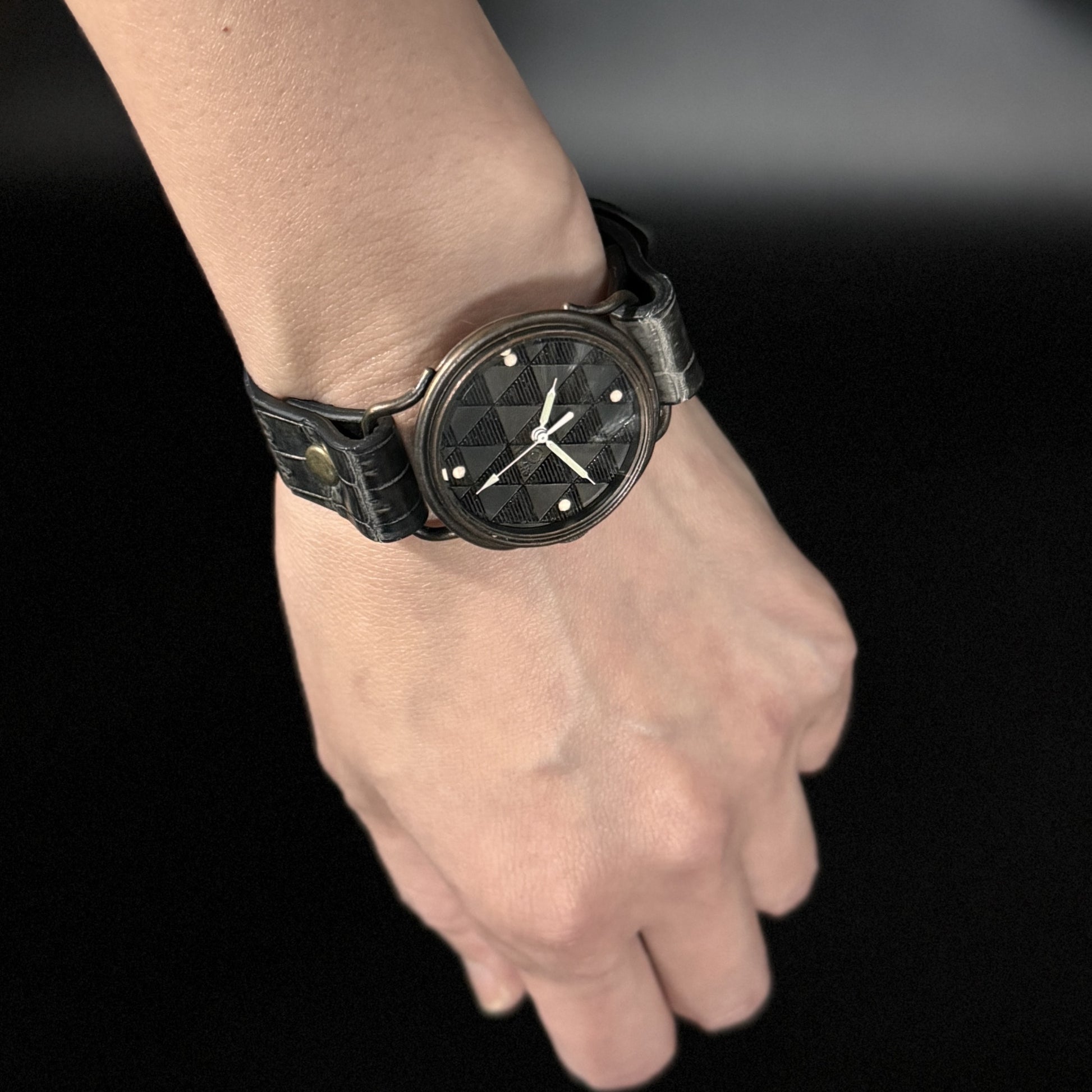 漆塗りに躍動感を加えた斬新な文字盤と墨染めカラーのクロコダイルバンドの組み合わせです。