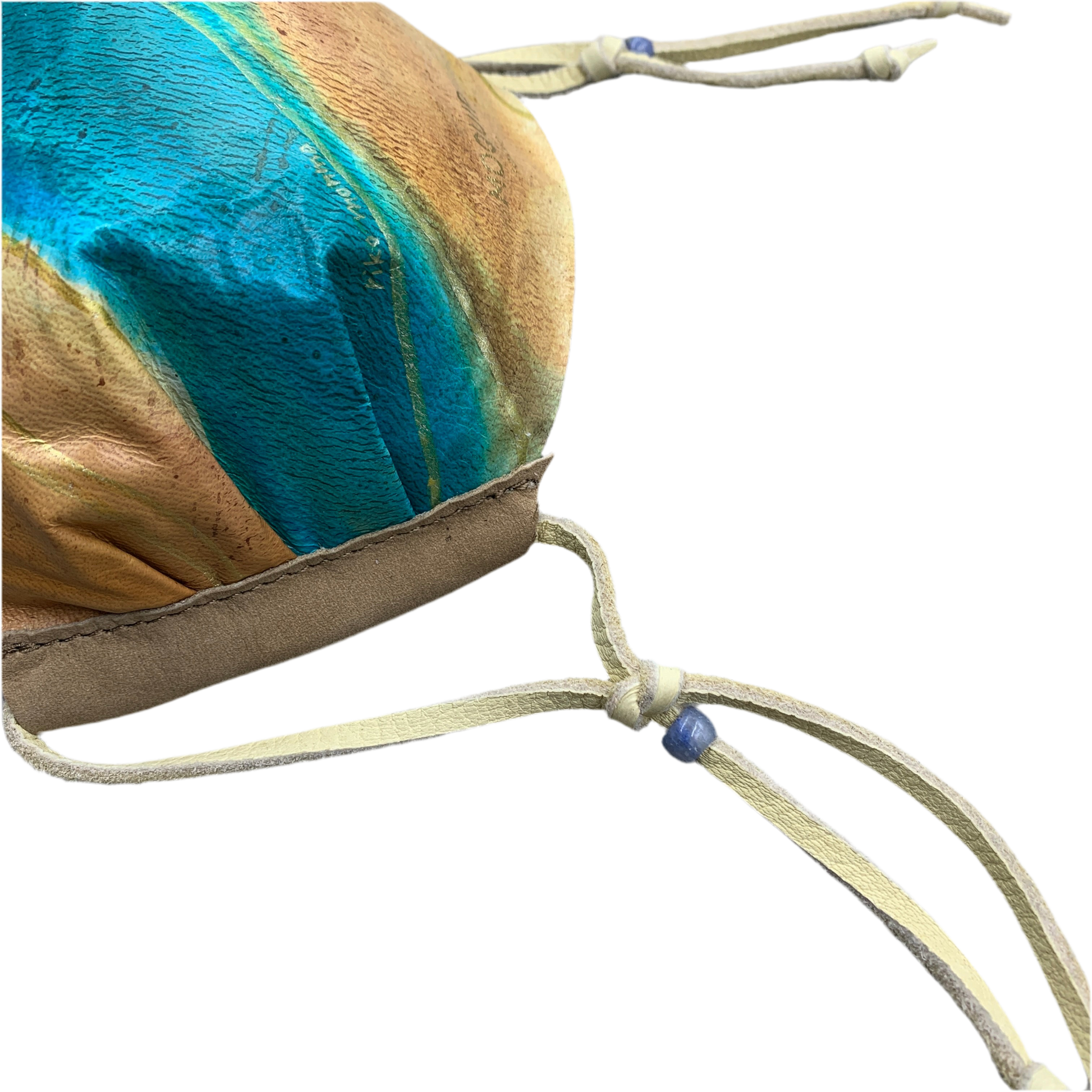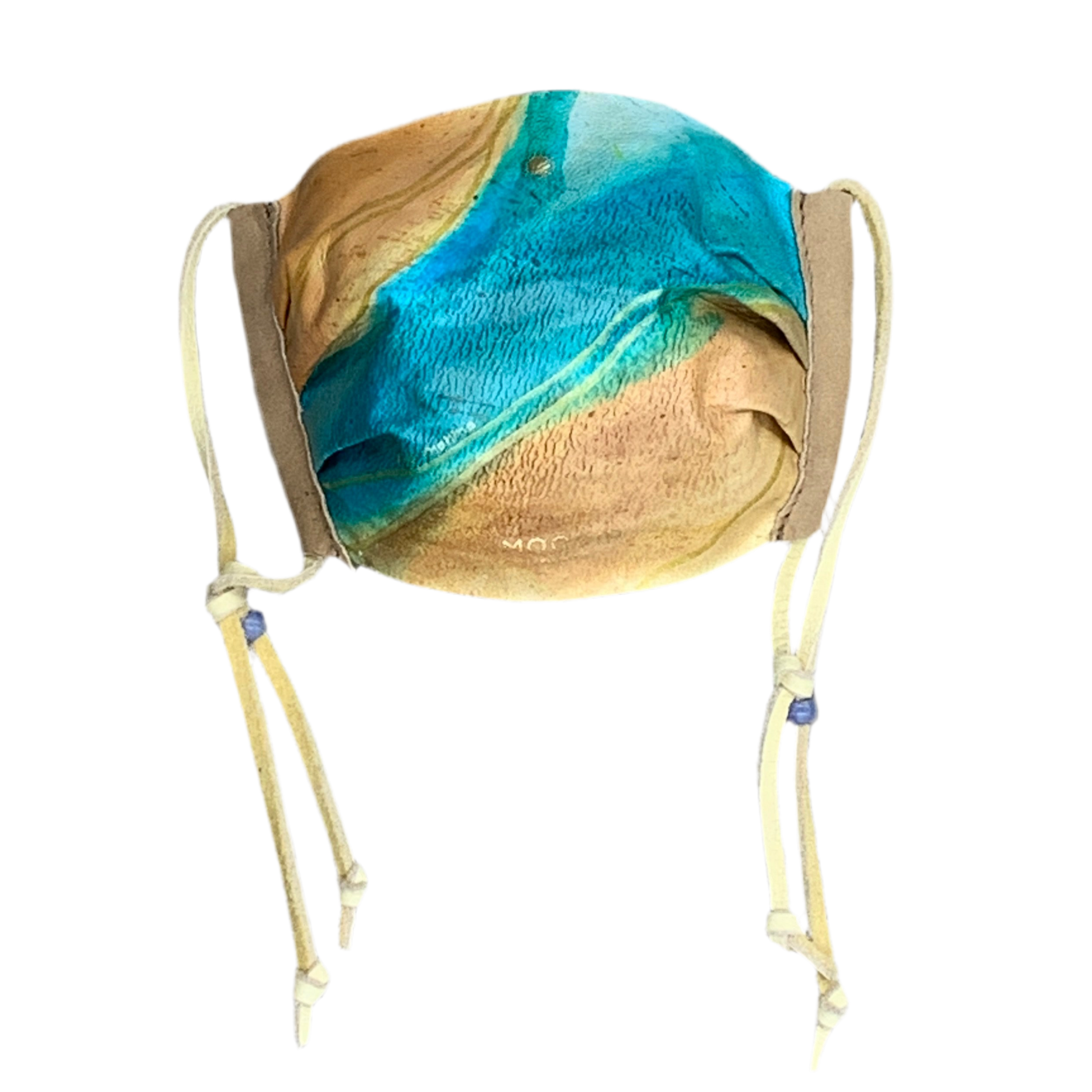 Natural blue agate beads are used to decorate the soft deerskin straps for adjustable fit of mask.