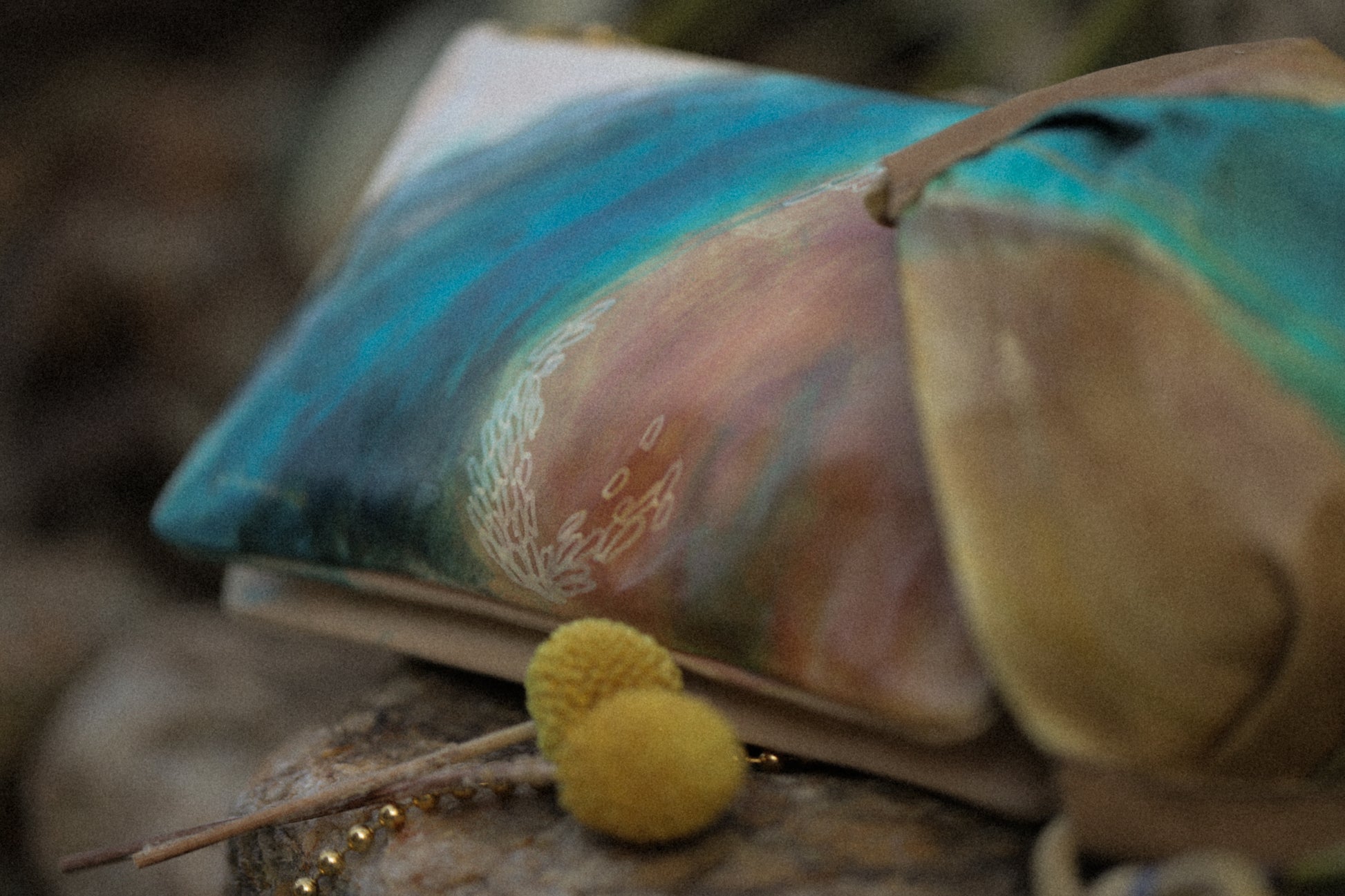 Shimmering waves, cloud motions, the gentle glow where sea meets the sky - painted by hand on sheepskin. Designed so you may enjoy the colour change of the leather and painting with usage over time.