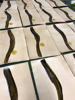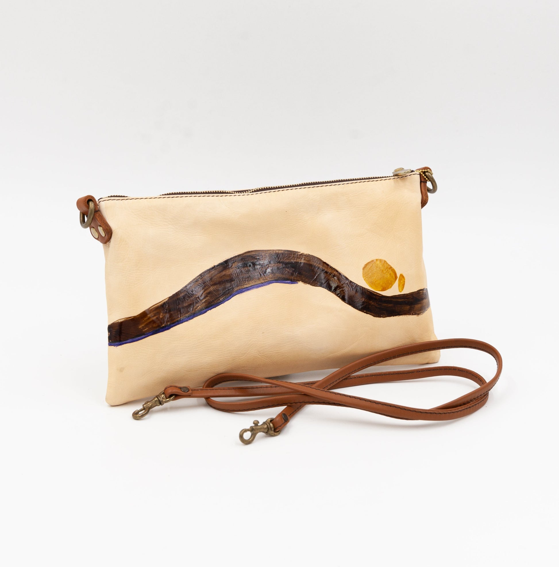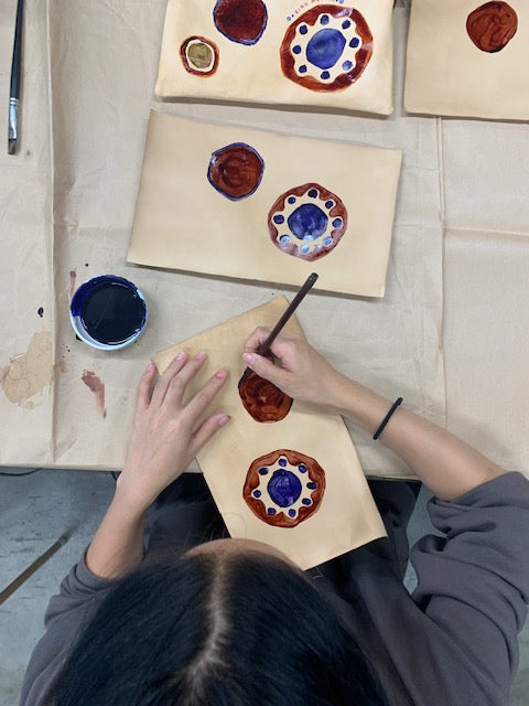 様々な要素からある一つの木の実が成るように、いろんな人との出会いや手助けによって思い描いた夢が形になっていく輪を羊革に描いています。伸びのある漆のような艶の顔料は革に馴染み、革本来の味と色の経年変化が楽しみな自由で遊び心のある持ち歩くアートに仕上がりました。羊革の表面には、砂糖を焦がして作られた絵の具で全体的にあめ色に色付けしています。